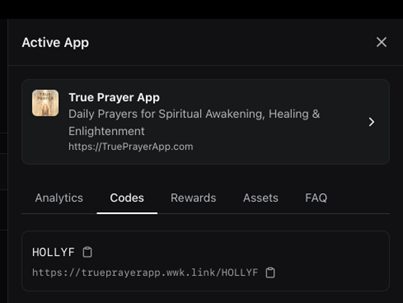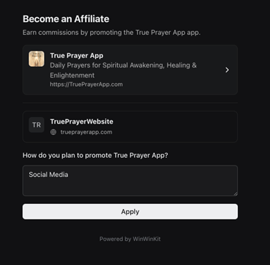 6. Once you are approved, you will first get an email from us and see True Prayer listed under “active” in your WinWinKit account. Click on True Prayer.