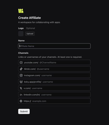 4. Create Affiliate – This is the name of your brand. Or, you can put your name again if you don’t belong to a brand.